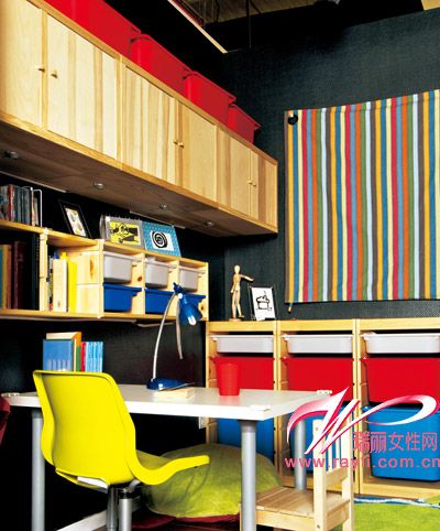 这个儿童房的设计中,将书桌上面的墙面空间充分开发,原木色的搁架成为收纳书籍的场所,一些经常使用的物品也可以放在这里。在搁架的上面,还有一排壁柜,这里的空间相对较大,适合收纳一些不经常使用的物品。